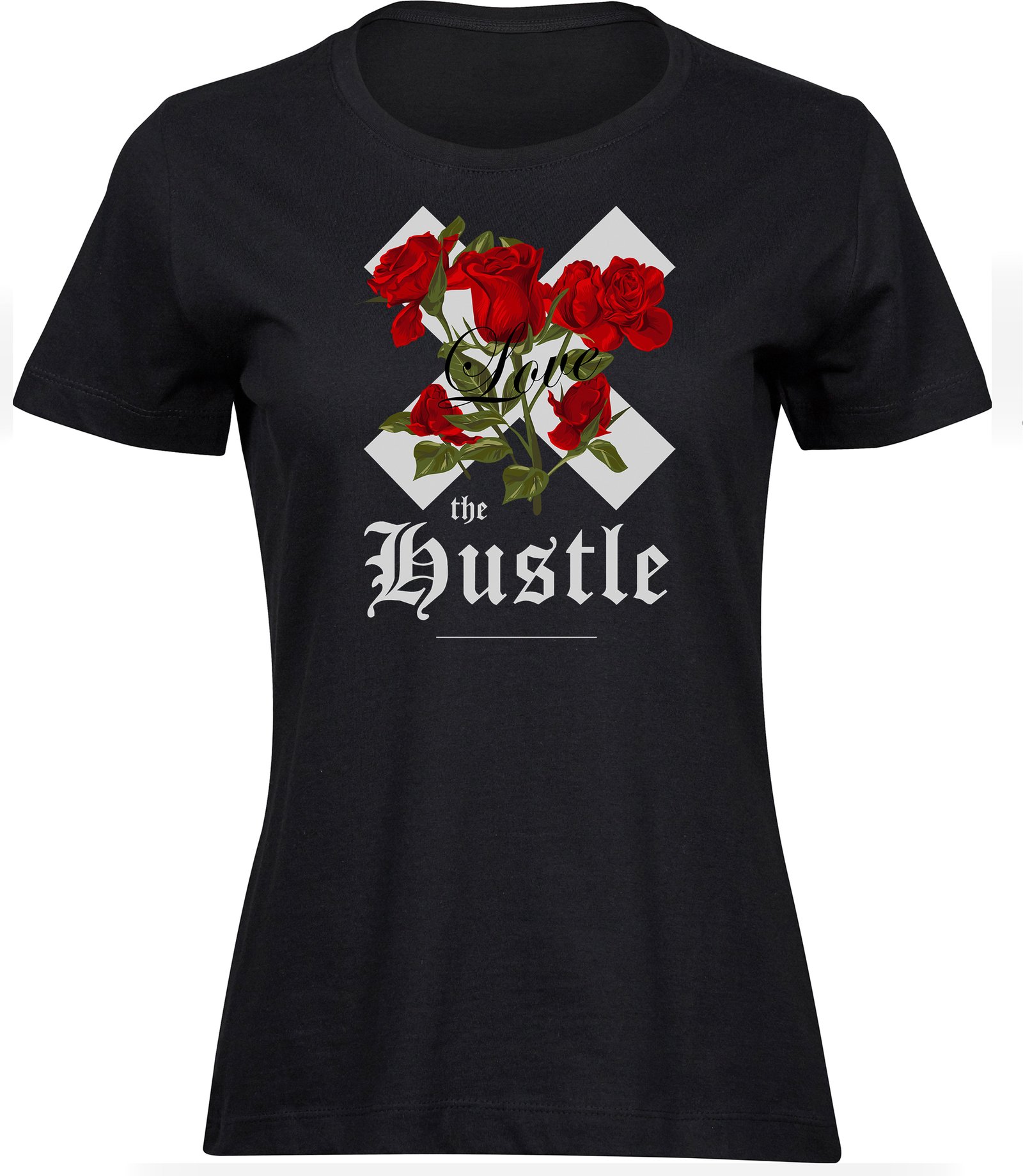 Marškinėliai moterims HUSTLE LOVE, juodi