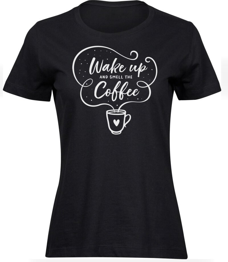 Marškinėliai moterims WAKE UP COFFEE, juodi